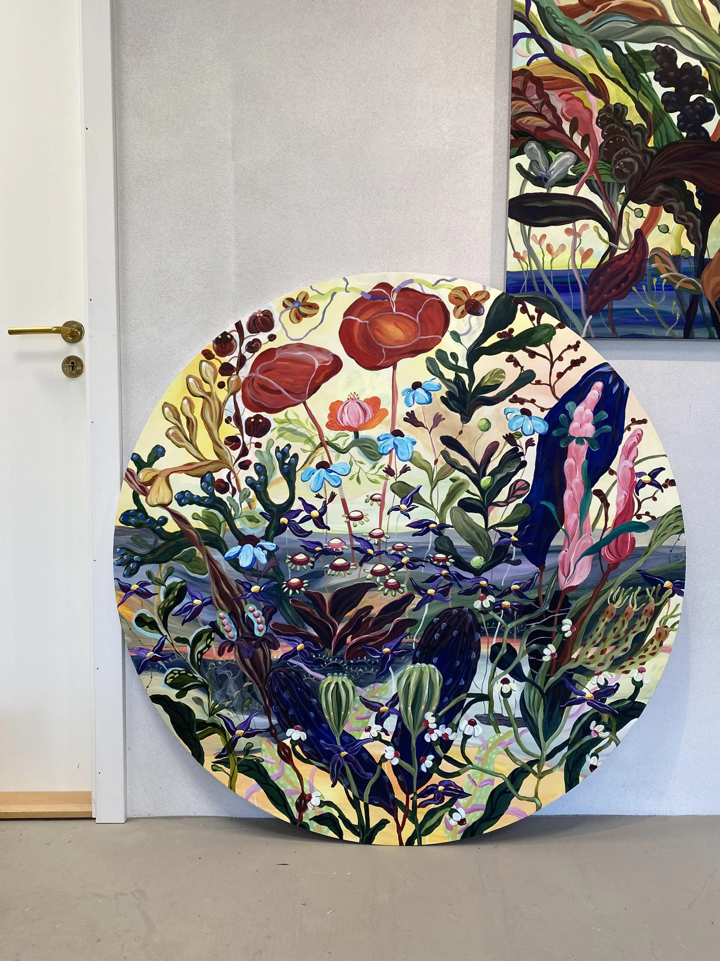 Captured in a quiet moment in my atelier by the Limfjord .Surrounded by light and plants I am working on World Wide Wave (200 × 200 cm), a large painting that carries the pulse of the fjord — movement, depth, and connection between worlds above and beneath the surface.